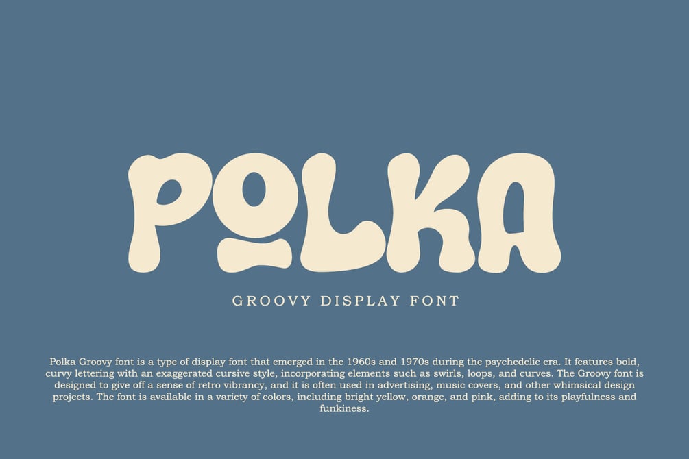 Polka Groovy font is a type of display font that emerged in the 1960s and 1970s during the psychedelic era. It features bold, curvy lettering with an exaggerated cursive style, incorporating elements such as swirls, loops, and curves. The Groovy font is designed to give off a sense of retro vibrancy, and it is often used in advertising, music covers, and other whimsical design projects. The font is available in a variety of colors, including bright yellow, orange, and pink, adding to its playfulness and funkiness.